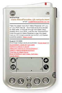 The Mobile/PDA section of 49ers Paradise is updated as often as the regular site's Hot Off The Press Section. It is complete with all of the day's top stories and even up to the minute scores!