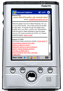 Any computer with a connection to the Internet can access the Mobile/PDA 49ers Paradise site. However, the site is designed for use with any Pocket PC or PDA with the Palm Operating Systems. The page can be accessed while your PDA is 'syncing' with your computer or if you have a mobile or wireless connection (including BlueTooth and Wifi), that allows you to surf the web directly from your PDA, you can access the site directly that way.
